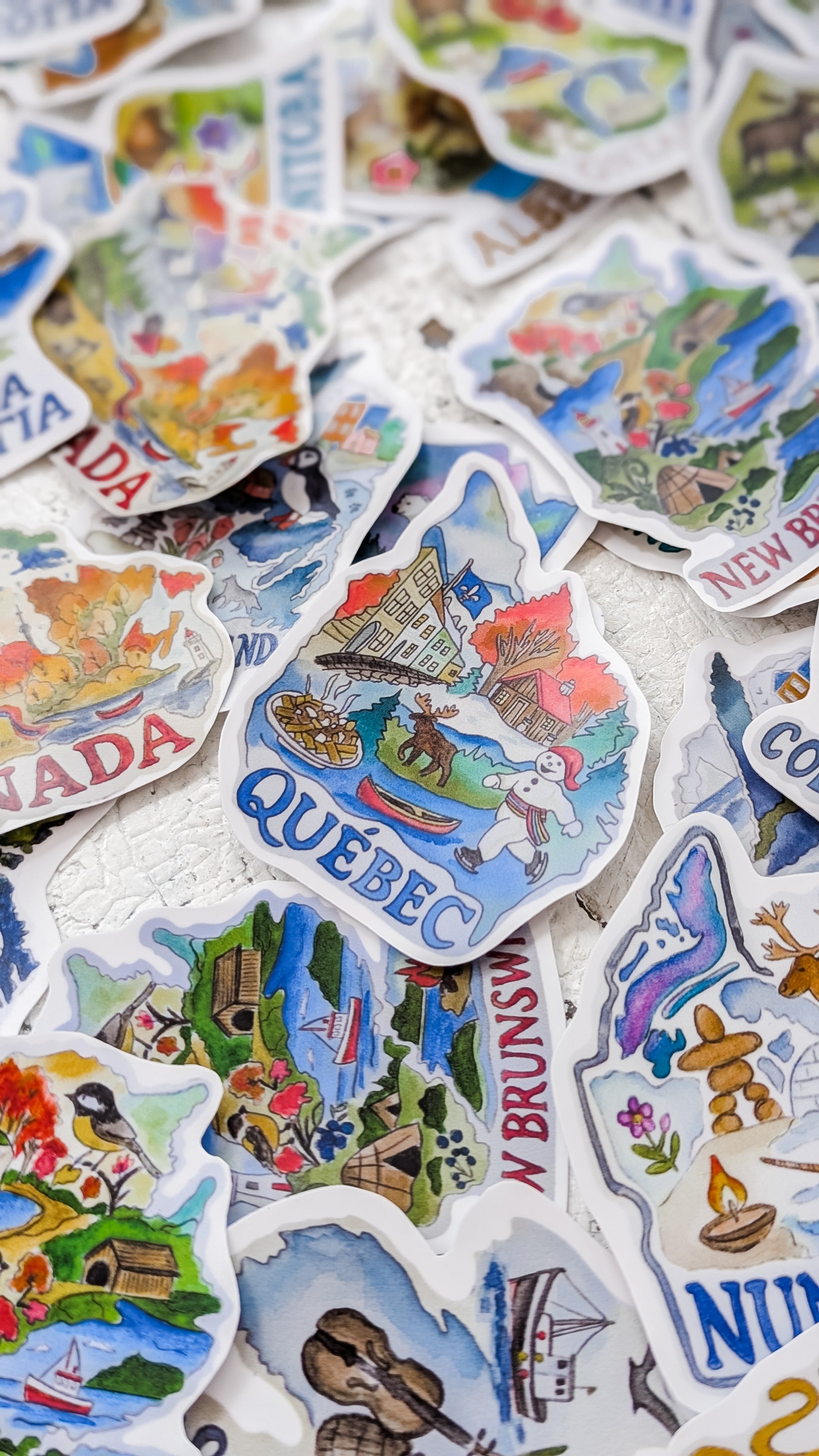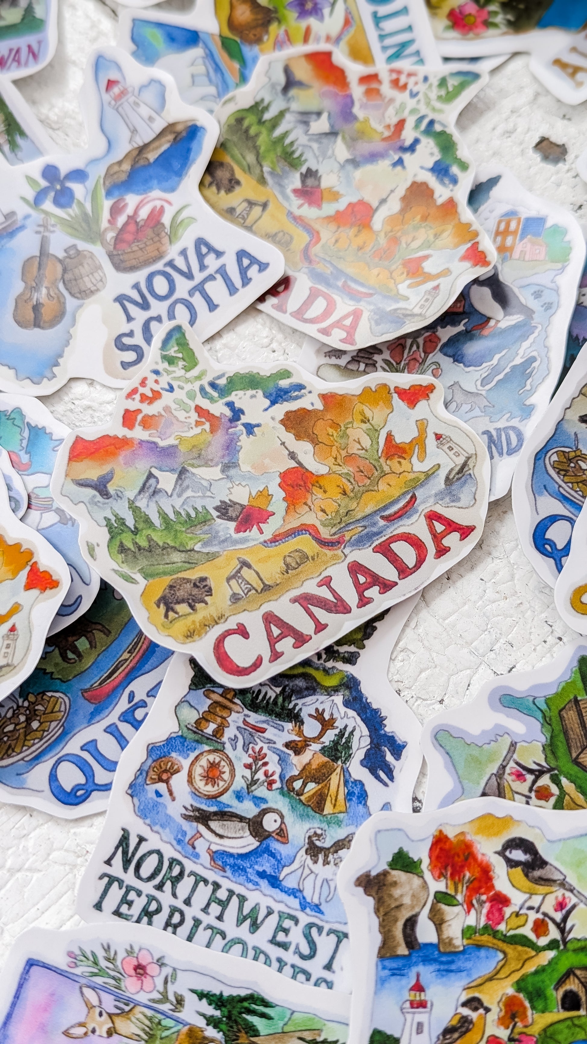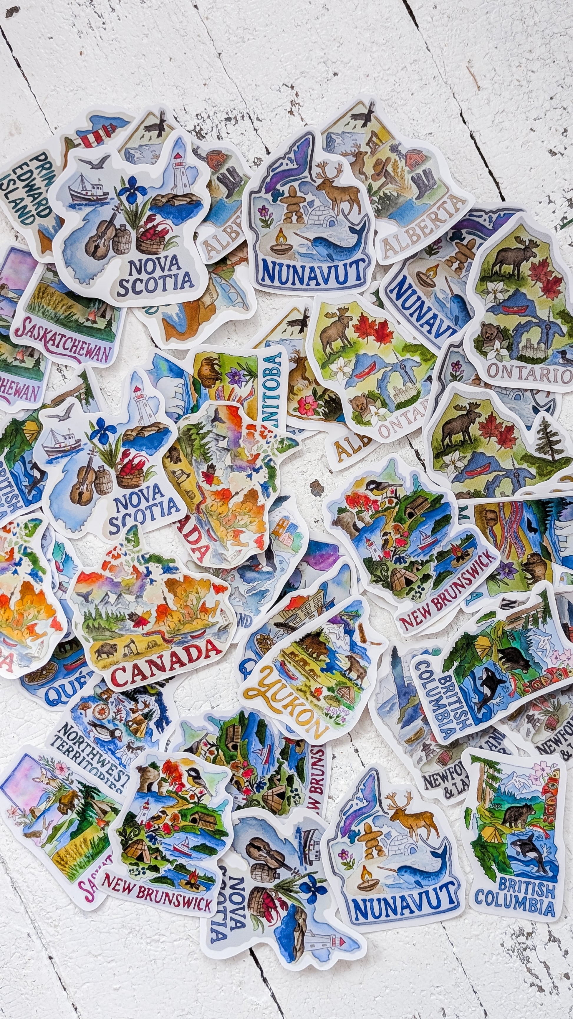 Bring a little piece of Canada wherever you go! These beautiful die-cut province shapes are created from my original watercolour paintings — available as either a weatherproof vinyl sticker or a durable magnet.